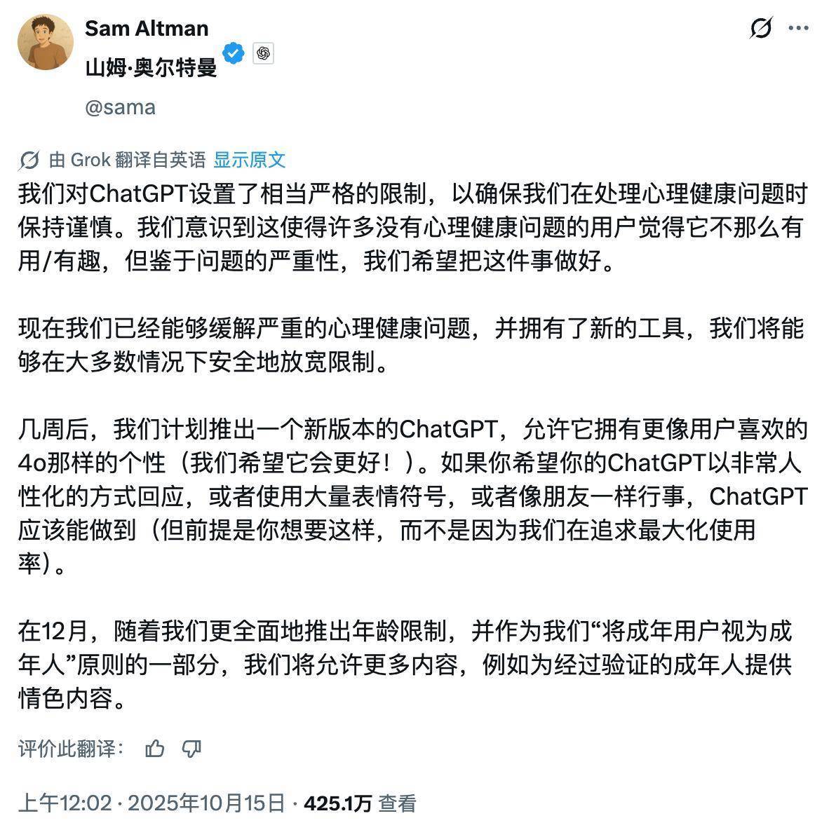 其实在去年末,奥特曼便已透露过关于“成人模式”的规划。